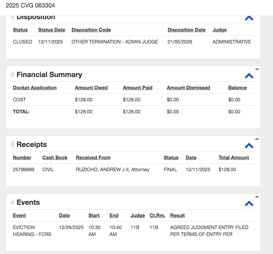 At the bottom of the picture above, you can see that the eviction hearing was scheduled for 12/29/2025. If you look up your case and see no hearing scheduled yet then the hearing has not been scheduled yet. Check again later.